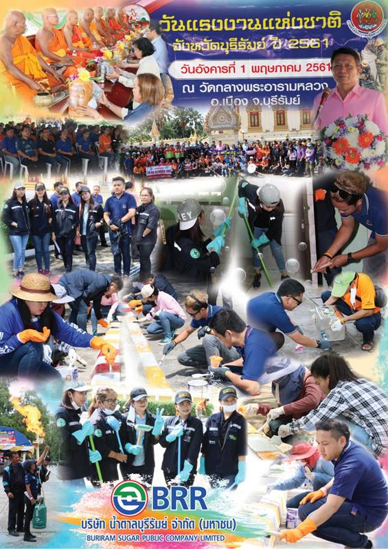เมื่อวันที่ 1 พฤษภาคม 61 บริษัท น้ำตาลบุรีรัมย์ จำกัด (มหาชน) และบริษัท ในเครือฯ ร่วมทำกิจกรรมกับสำนักงานสวัสดิการและคุ้มครองแรงงาน จังหวัดบุรีรัมย์ และหน่วยงานในสังกัดกระทรวงแรงงาน และสถานประกอบกิจการในพื้นที่จังหวัดกว่า 30 แห่ง รวมกว่า 200 คน โดยนายอนุรัฐ ไทยตรง รองผู้ว่าราชการจังหวัดบุรีรัมย์ เป็นประธานเปิดงานวันแรงงานแห่งชาติจังหวัดบุรีรัมย์ ประจำปี 2561 ณ บริเวณลานวัดกลางพระอารามหลวง อ.เมือง จ.บุรีรัมย์ จัดกิจกรรมขึ้นเพื่อให้นายจ้างได้ตระหนักถึงความสำคัญขอวันแรงงานแห่งชาติ ตลอดทั้งให้นายจ้าง ลูกจ้างและส่วนราชการได้ทำกิจกรรมสาธารณประโยชน์ กิจกรรมสร้างความรักความสามัคคีร่วมกันภายใต้แนวคิด แรงงานปลอดภัย ร่วมใจจิตอาสา กิจกรรมประกอบไปด้วย การรวมพลังจิตอาสาทำความสะอาดบริเวณโดยรอบ และทาสีฟุตบาท ตลอดทั้งการทำความสะอาดห้องน้ำของวัดกลางพระอารามหลวง กิจกรรมทำบุญถวายภัตตาหารเพลแด่พระภิกษุสงฆ์จำนวน 9 รูป การสาธิตใช้ถึงดังเพลิงที่ถูกต้องเพื่อป้องกันและระงับอัคคีภัยขับเคลื่อนโครงการ Safety Thailand