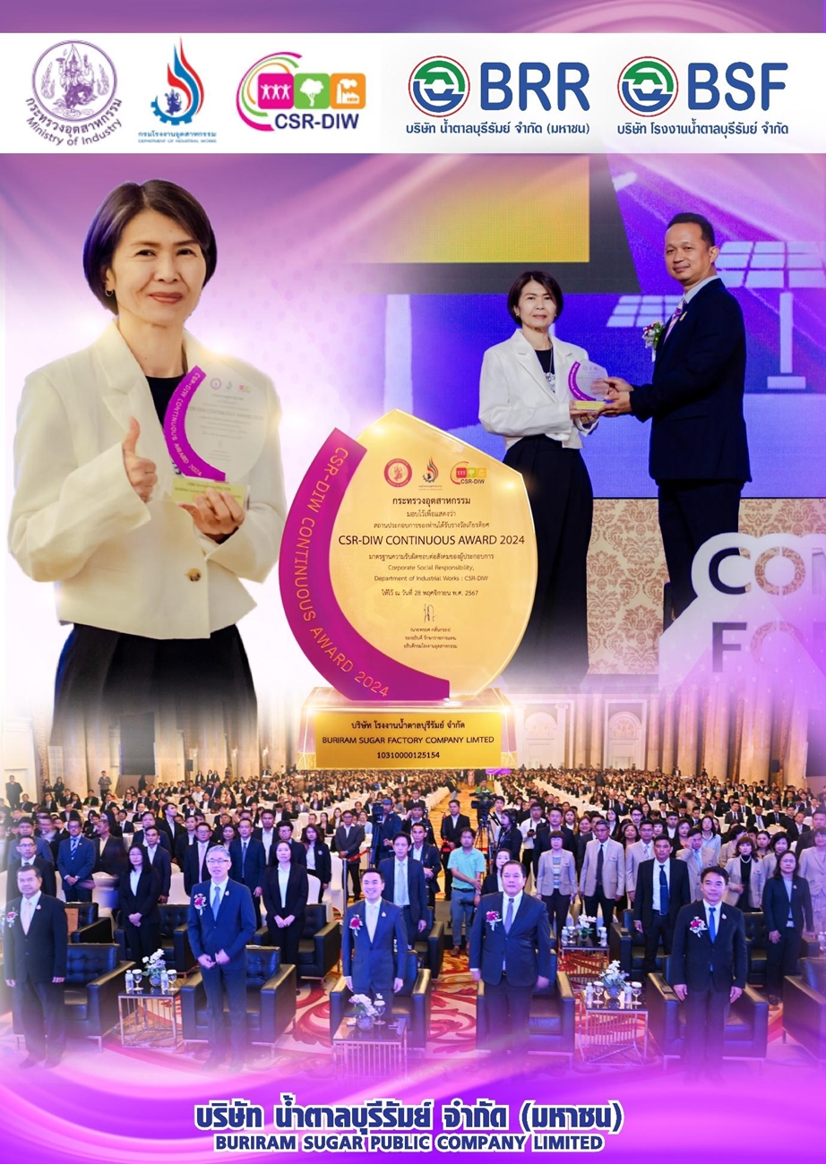 บริษัท โรงงานน้ำตาลบุรีรัมย์ จำกัด โดยนางสาวจิตติมา ตั้งตรงเวชกิจ รองประธานเจ้าหน้าที่บริหาร เข้ารับรางวัล CSR-DIW Continuous 2567 ซึ่งบริษัทฯ ผ่านเกณฑ์มาตรฐาน ความรับผิดชอบต่อสังคม ในปี 2567 ได้รับรางวัลตามมาตรฐาน CSR-DIW และรักษามาตรฐาน CSR-DIW ต่อเนื่อง (CSR-DIW Continuous) ตามมาตรฐานความรับผิดชอบต่อสังคม (ISO26000) ภายใต้โครงการส่งเสริมความรับผิดชอบต่อสังคมและชุมชนเพื่อเป้าหมายการพัฒนาเศรษฐกิจชุมชนและจัดการสิ่งแวดล้อมอย่างยั่งยืน (CSR-DIW to BCG model for Three Pillars of Sustainability)